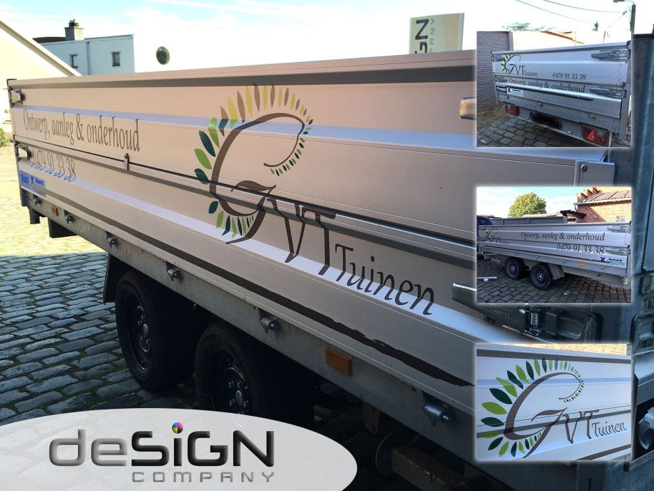 Reclame voor een tuinaanemer op de remorque geplaatst in 3 kleuren. Gegarandeerd de beste reclame die er is !