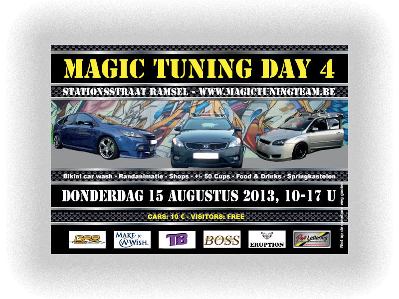 Voor de dagmeeting op 5 augustus 2013 werd ons de opdracht gegeven een A5 flyer te ontwerpen voor Magic Tuning Club te Ramsel. Op de achtezijde werden tal van sponsors vermeld en de voorzijde was bestemd voor alle nodige informatie.
