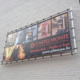Deze spandoek is een hoge kwaliteits bache, werd voorzien van een full color print en er werden ringen in gezet om deze op te spannen. De frame is op maat gemaakt en het materiaal is inox. Dit geeft zeker een meerwaarde aan de spandoek omdat we hier geen randen zien of stukken die apart in elkaar gestopt zijn. Inox heeft ook de eigenschap om niet te roesten en kan dus heel lang meegaan in weer en wind.